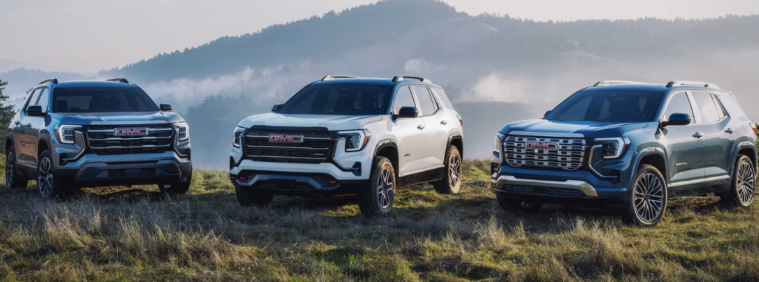 Three 2025 GMC Terrain models parked in a field